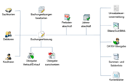 Die Software hält eine Reihe von Auswertungsmöglichkeiten bereit. Angefangen von einfachen Gegenüberstellungen von einzelnen Konten bis hin zur komplexen Gewinn- und Verlustrechnung sowie betriebswirtschaftlichen Auswertungen. Sie behalten damit immer die Übersicht und können gezielt Planen und Steuern.